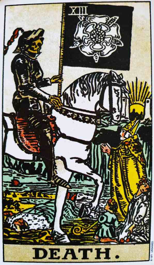 נתחיל, אם כן, בפענוח הקלף. להלן תרגום (חופשי) של הטקסט שכתב האח א.א. וייט על הקלף ה 13, בחיבורו המדריך המצויר לטארוט: "החיים מעולפים ומונצחים בשינוי, טרנספורמציה ומעבר מהנמוכים לעליונים, וזה מיוצג בצורה טובה יותר בטארוט המתוקן על ידי אחד החזונות האפוקליפטיים מאשר על ידי התפיסה הגסה של השלד הקוצר. מאחורי [הקלף] מסתתר כל עולם ההשגבה ברוח. הסוס המסתורי נע לאט, נושא דגל שחור עליו מתנוסס ורד המיסתורין, המסמל חיים. בין שני עמודים, על סף האופק זורחת השמש האלמותיות. הרוכב אינו נושא נשק גלוי לעין, אך מלך, ילדה ובתולה נופלים לפניו, ואילו בישוף בידיים אחוזות ממתין לסופו.