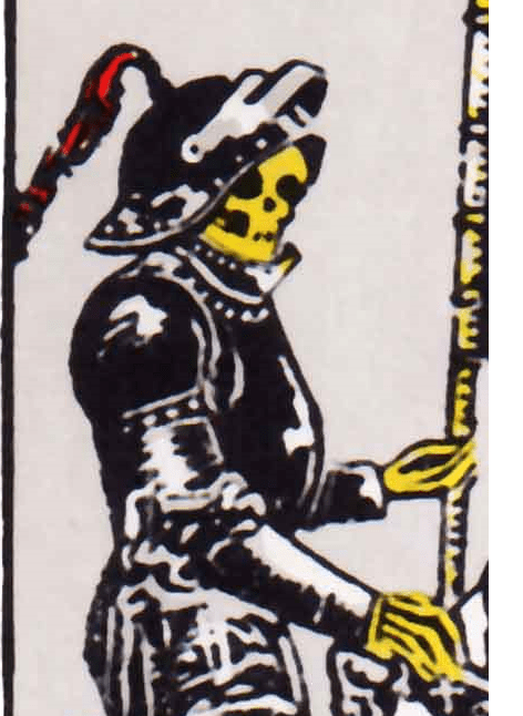 יחד עם הזיהוי הזה של השלד הקוצר בתור הרוכב בקלף המוות, האח וייט מבהיר כי בגרסה המעודכנת [של הקלף] הייצוג של מלאך המוות בתור ה"רוכב" מדויק יותר מאשר ה"התפיסה הגסה של השלד הקוצר", וזו גם הסיבה שאצל וייט המלאך איננו נושא כלי נשק. הרוכב של וייט גם שונה מרוחות המוות שהיו מוכרות בתרבות האירופית הקדם-נוצרית, שהיו בעיקר דמויות נשיות (כמו הולקיריה או הפסטה הנורדיות, או הבאנשי הקלטית). כדי לדייק את הזיהוי של דמות הרוכב בקלף, מציע האח וייט את הרמז שהמוות המיסטי בקלף הוא שינוי בתודעה, ושהרוכב נושא את דגל "ורד המיסתורין". הדגל השחור מתנוסס במרכז התמונה ומכיל ציור של פרח בעל חמישה עלי כותרת.